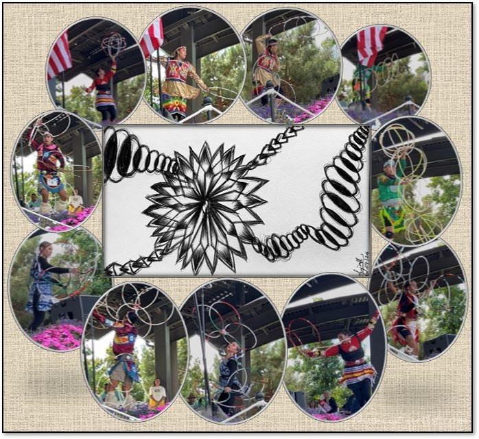 The hoop, considered sacred, often as the medicine-wheel, has been used by Native American tribes for generations in healing ceremonies. Hoop Dance is a form of story telling and performed by a single dancer, where they dance to the rhythmic beats of the drum, with their feet and body spinning, twirling and throwing the hoops around their bodies creating patterns as they move through space and time. Each tribe has a unique signature of the movements and regalia, passed through generations by the elders. The hoops are usually made of reeds or wood, and dancers often depict patterns meaningful to their tribe, viz., eagles, butterflies, fish, snake, turtles.